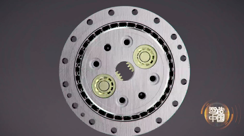 打开RV减速机,里面就像一个太阳系,既有太阳轮,也有行星轮。这就是RV减速机的摆线行星轮,它们就像围绕太阳的行星,既有自转也有公转,自转一圈的同时公转40圈,通过多组行星运动实现精密传动,把电机的高速转动降下来,同时增大转矩,驱动机器人手臂旋转。