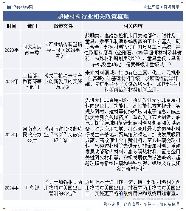 近年来,我国政府相关部门高度重视超硬材料行业的发展,出台了一系列出口管制措施和产业发展引导政策以及措施来支持并引导该行业的持续健康发展,鼓励发展高性能磨料磨具(金刚石、CBN等超硬材料及其微粉,特殊材料磨削用砂轮),重点发展芯片制造、油气钻探等领域用复合超硬材料及制品和关键装备,扩大应用领域,打造全球最大的超硬材料研发生产基地。