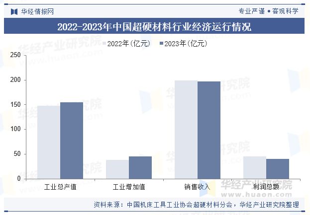 超硬材料及制品基于其优异的性能,已在民用方面成为超精密加工、高速高效加工和绿色环保加工的不二选择,广泛应用于高档数控机床、芯片制造、汽车制造、光伏新能源、油气钻探、生物医药等重点国民经济领域。伴随着制造业的迭代升级和下游产业需求的增长,超硬材料作为关键原材料,其需求量持续增加,2023年中国超硬材料行业工业总产值约为155.3亿元,行业销售收入与利润总额分别为196.8亿元、41.1亿元,行业虽面临较大的压力,但仍缓速发展。