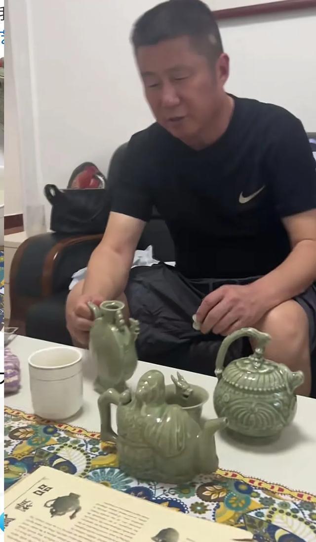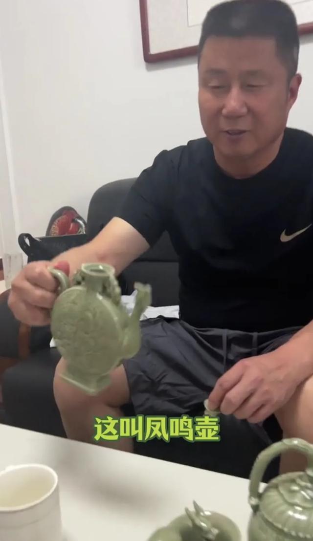 女生的父亲先是往其中一把看起来扁扁的茶壶里面倒了一些水,然后就在女儿的镜头下给大家介绍起这几个壶的名字和它们的“秘密”。