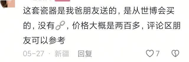 女生也在这条视频的底下回复说:这套瓷器是她爸爸的朋友送的,价格在两百多左右。
